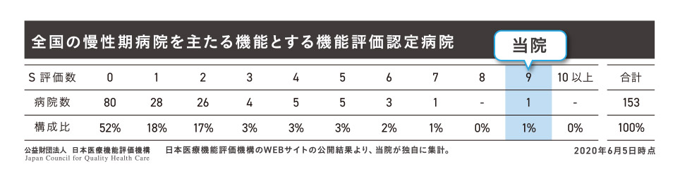 日本医療機能評価機構が公表する「病院機能評価データブック2018年度(2020年5月)」より、最新の機能種別版評価項目 3rdG:Ver2.0にて受審した、急性期病院を含む全病院のS評価獲得数を当院が独自に集計。10以上のS評価を獲得した病院は全体の2%、わずか8病院(全て急性期病院)でした。