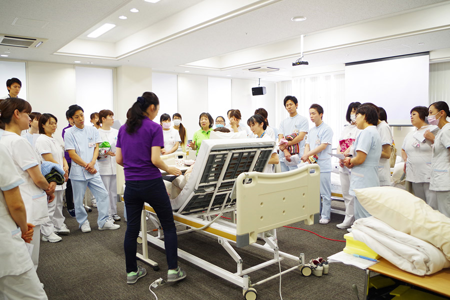 看護職・介護職、全ての病棟スタッフを対象とした、オムツ交換や体位変換等の技術研修。各病棟で指導ができるように全員が受けられるよう長期にわたり実施しました。