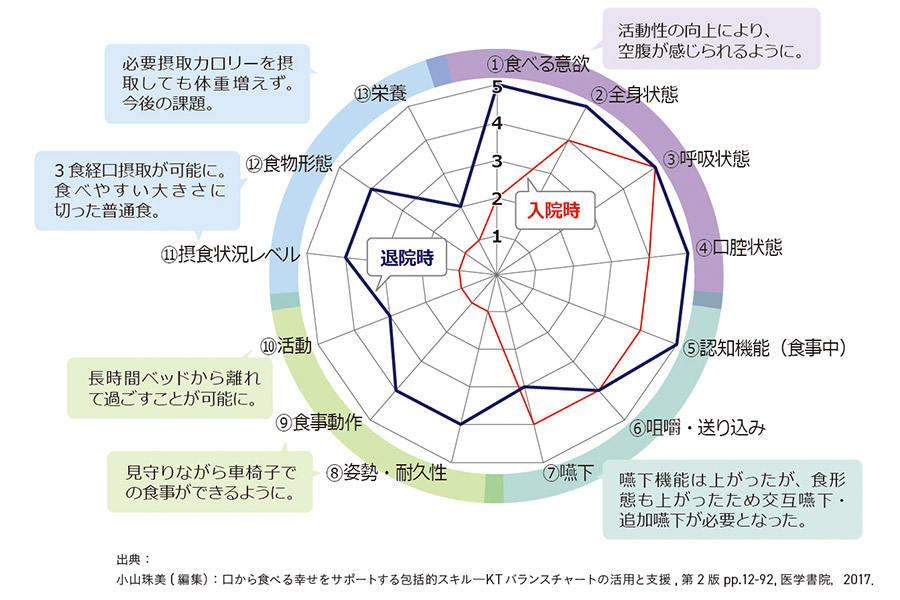 NPO法人 口から食べる幸せを守る会理事長の小山珠美先生が作成されたKTバランスチャートを用いて患者さまの状態を評価します。強みと弱みを可視化し、アプローチを行います。