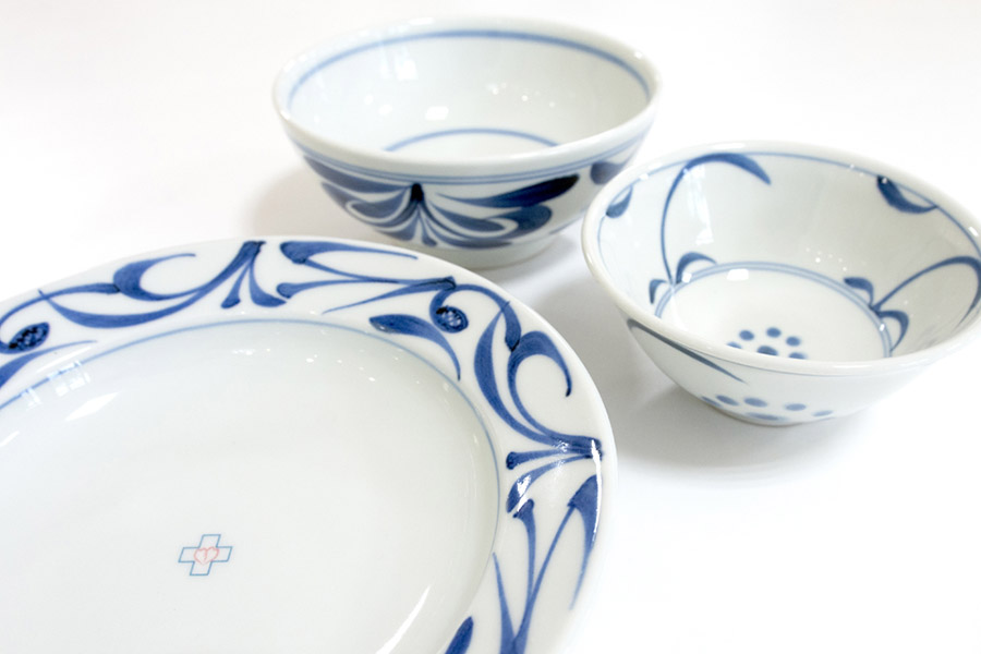 器は、食事のおいしさを演出する大切な要素のひとつ。色や形、手になじむ重さや大きさ。産地へ赴き、使い勝手を検討してつくったオリジナルの「砥部焼」の器を使用しています。