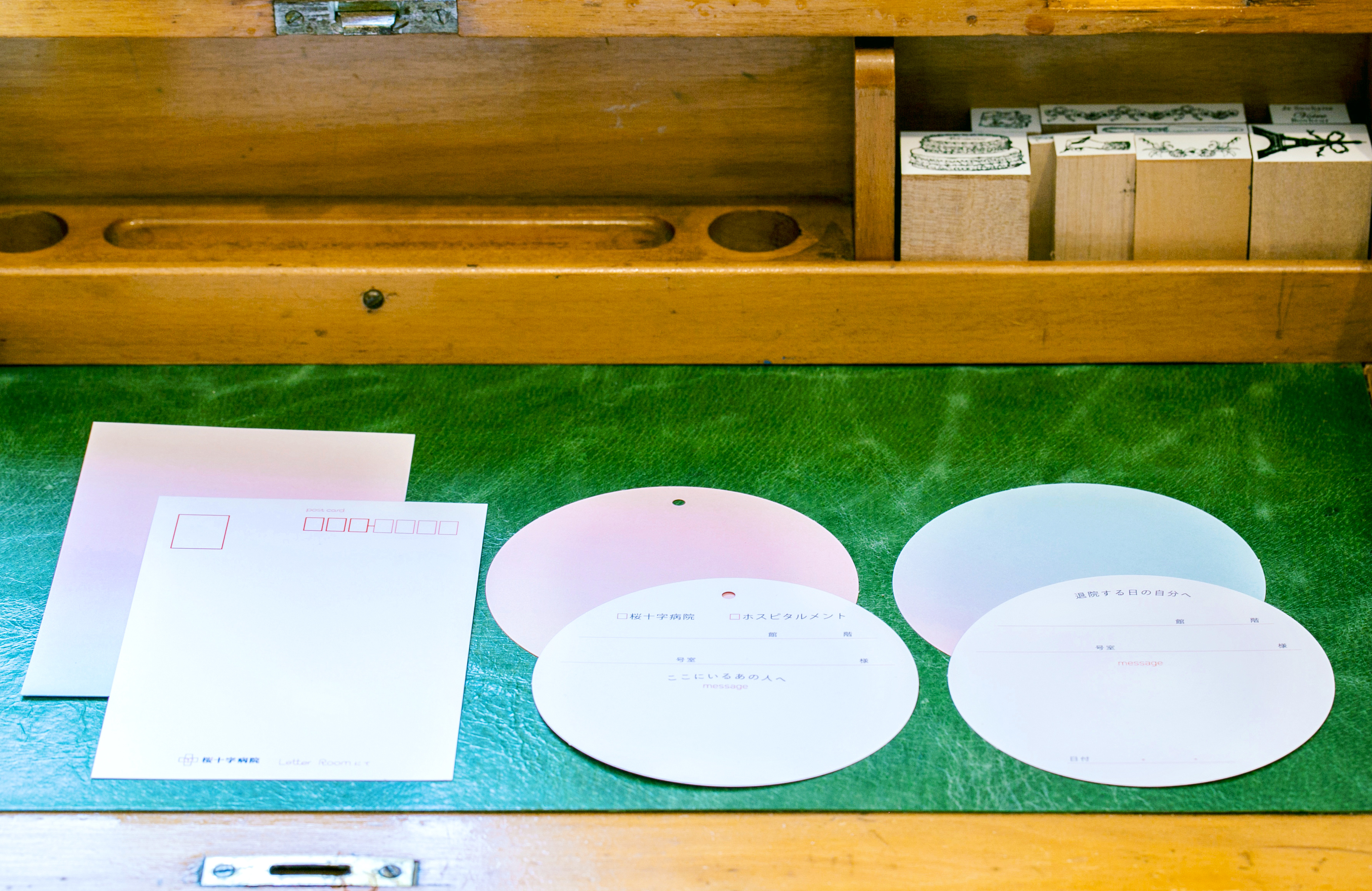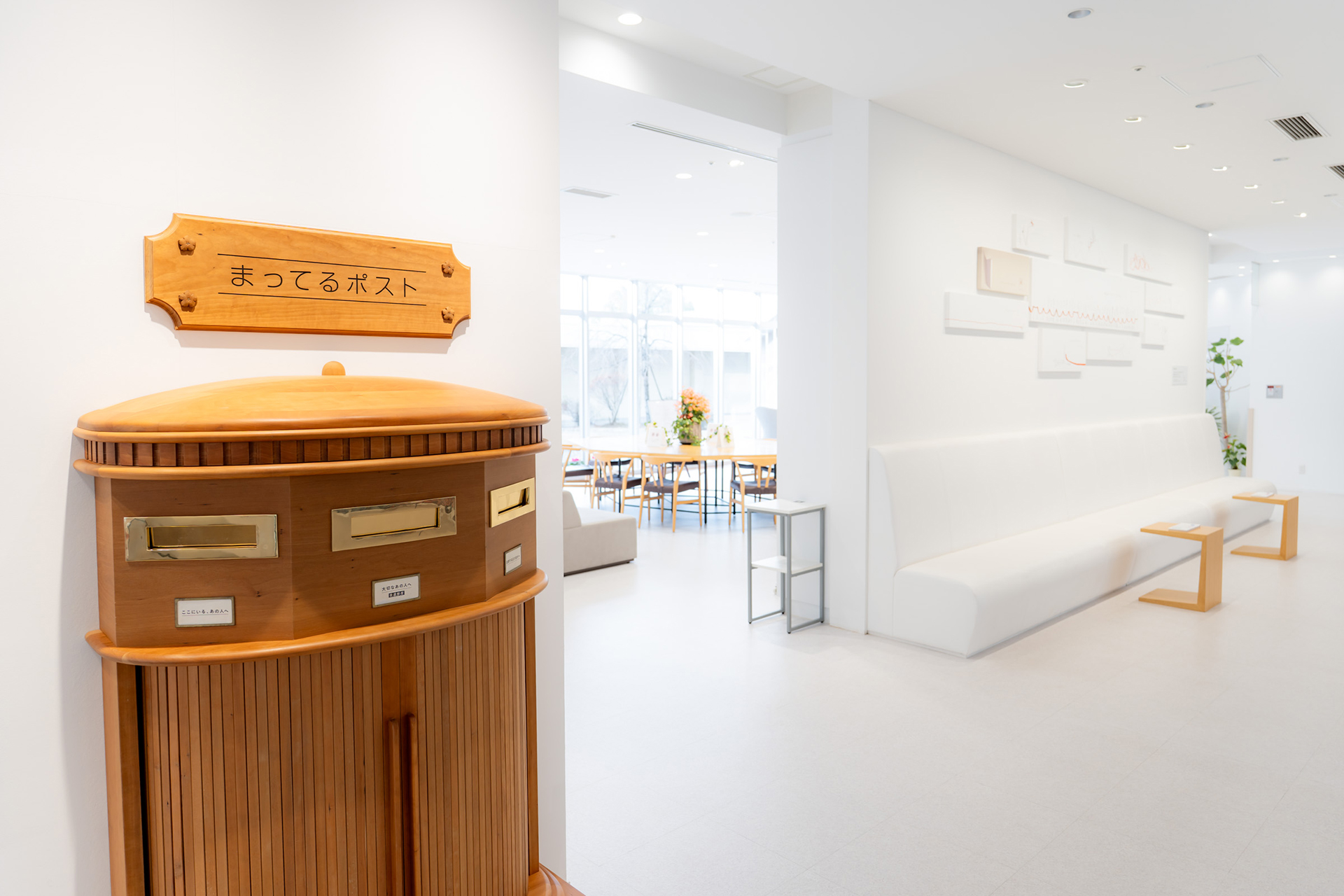 ライブラリーの横にある、ちょっと特殊な2種類のお手紙と普通郵便、3種類のお手紙を投函いただけるポストです。「ここにいる、あの人へ」宛てたお手紙は、病院の患者さまやホスピタルメントにお住いのお客さまにお届けします。「退院する日の自分へ」は、未来の自分に宛てたお手紙を、退院する日にお届けします。戦前のポストをモチーフに、桜のレリーフをあしらった桜の木でできたポストです。