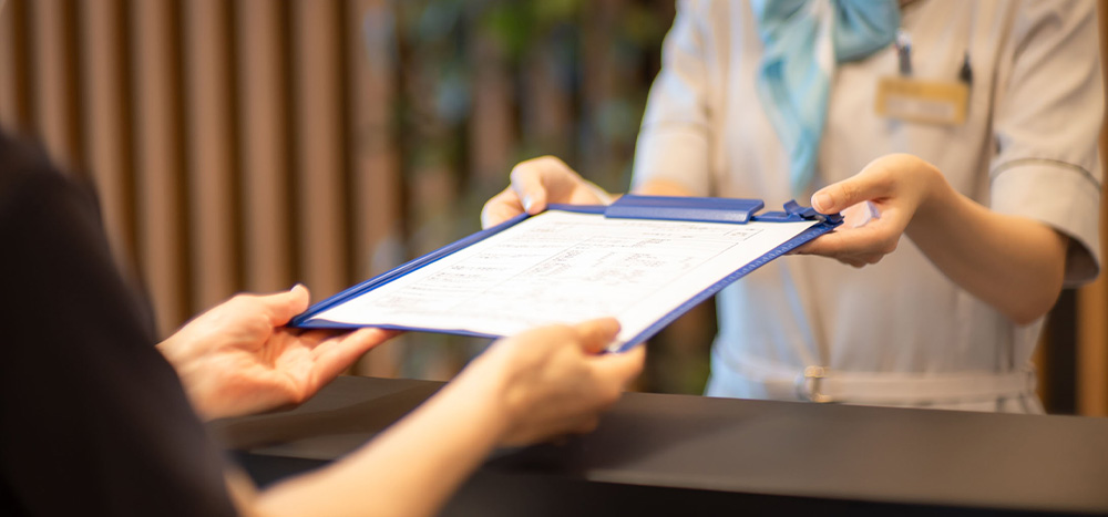 初診の方 / 受付にてマイナンバーカード(健康保険証)の提出と、問診表の記入をお願いします。また紹介状をお持ちの方はお申し出ください。