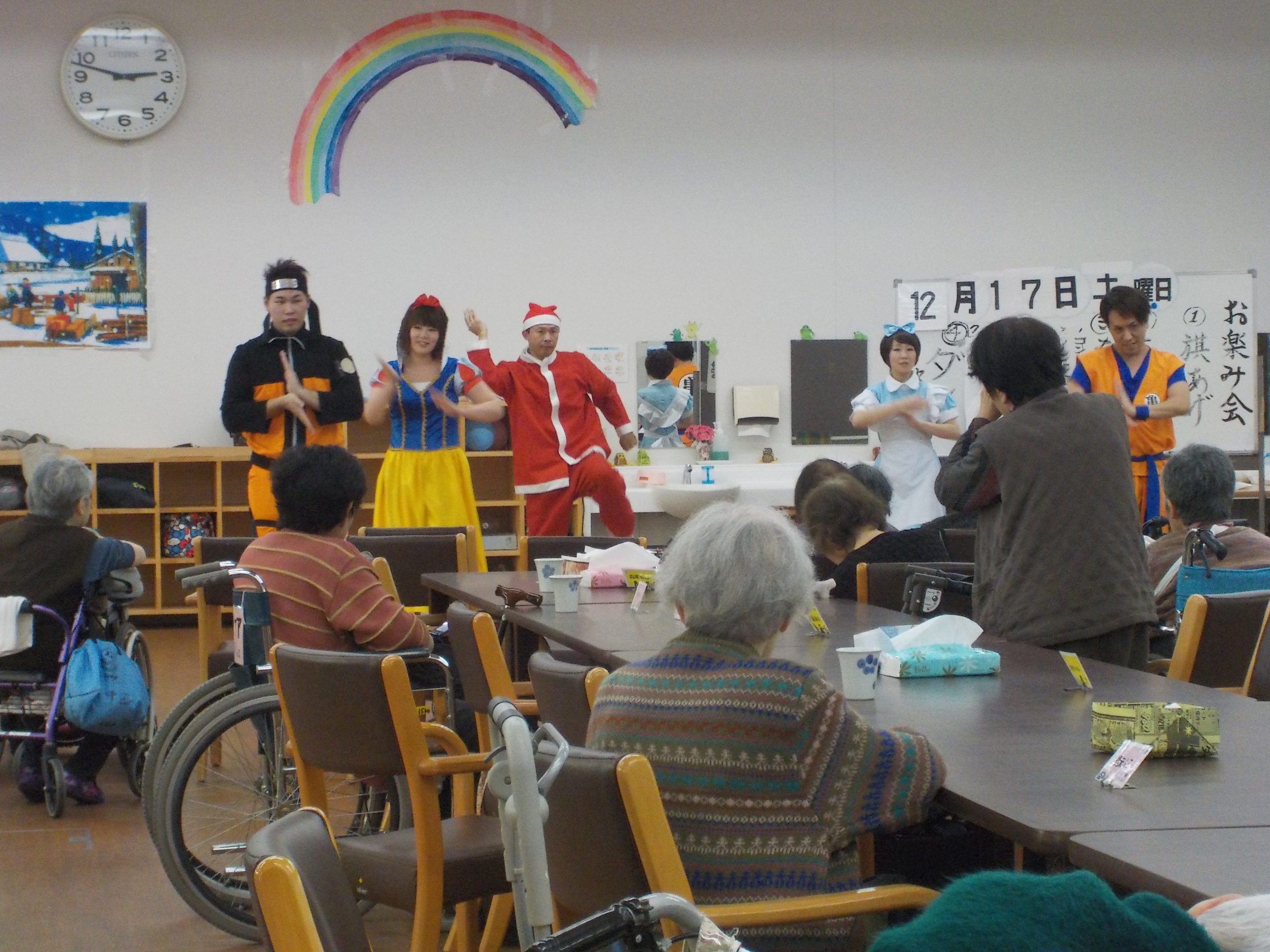 今年のクリスマス会では、今では恒例の二人羽織りや認知機能と手先の運動になる旗揚げゲームなど様々な催し物を行いました。