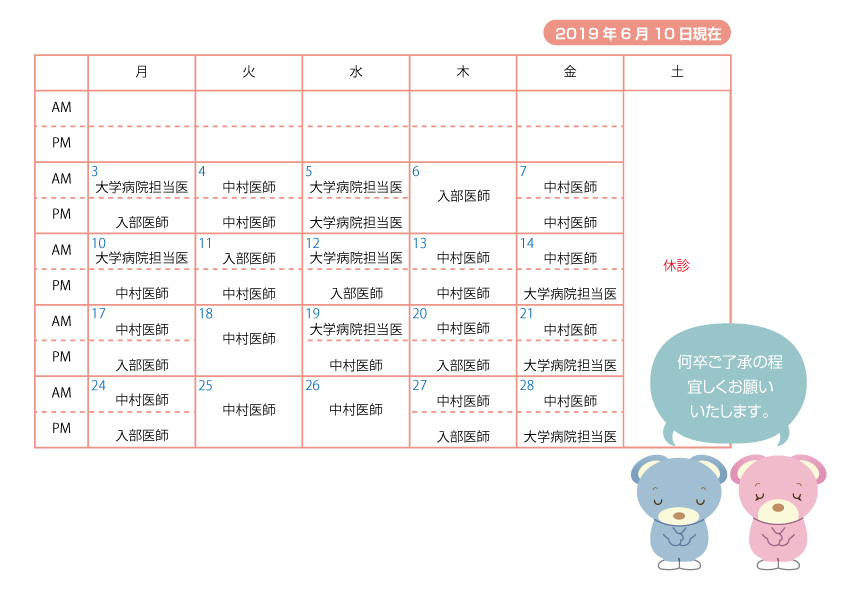 2019/05/31 休診のお知らせ 6月の診療体制のお知らせ <6月18日(火)現在の変更点のご案内> 6月24日(月)午後:入部医師→中村医師 6月25日(火)終日:中村医師→入部医師 何卒ご了承の程、宜しくお願いいたします。 前の記事へ 次の記事へ