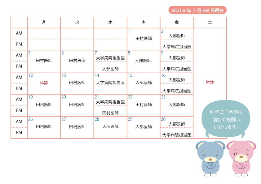 8月の小児科診療体制のカレンダーを更新いたしました。