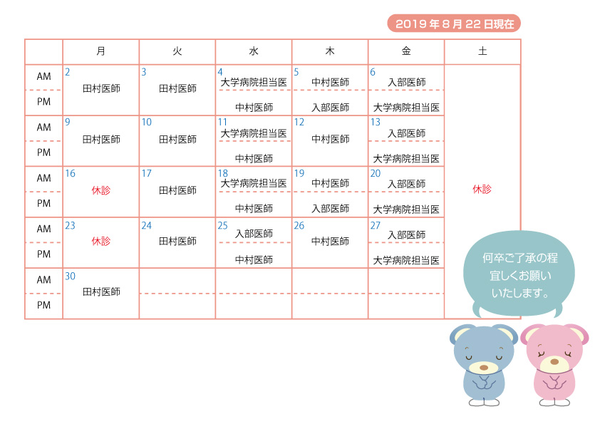 8月23日(金)現在 9月の小児科の診療体制をお知らせいたします。