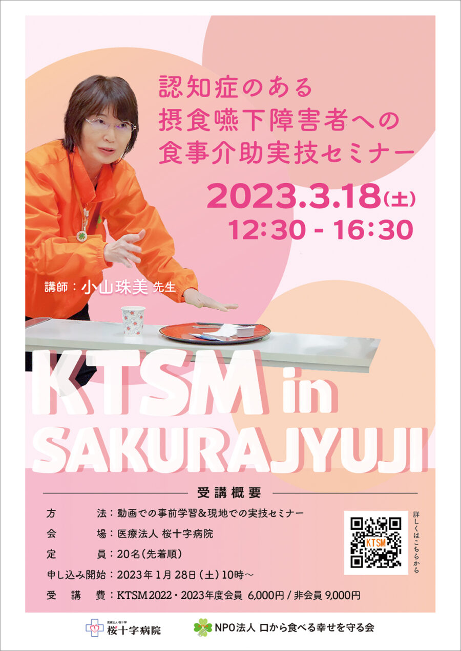 桜十字病院でKTSM(口から食べる幸せを守る会)による実技セミナーを開催いたします。講師としてKTSM理事長である小山珠美先生を迎えて、講演と実技のセミナーを行っていただきます。