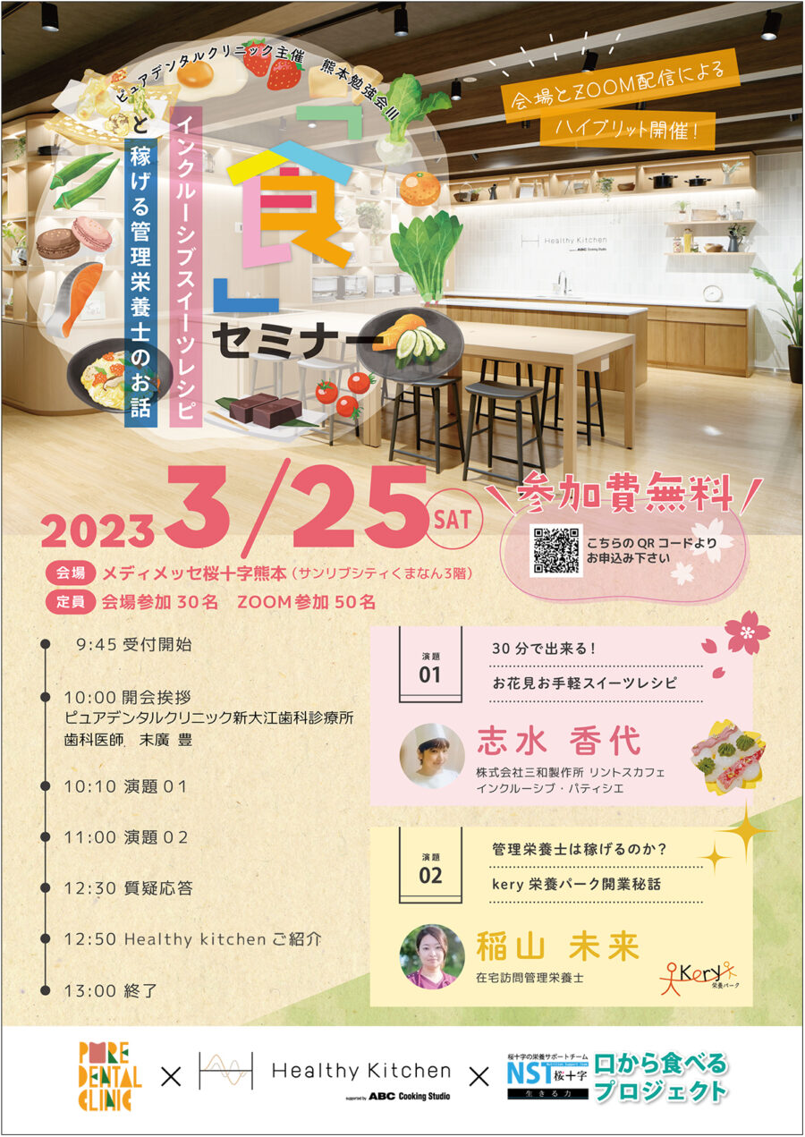 ピュアデンタルクリニック様主催、メディメッセ桜十字のヘルシーキッチンと桜十字病院の口から食べるプロジェクト協催で、「食」セミナーを開催致します。