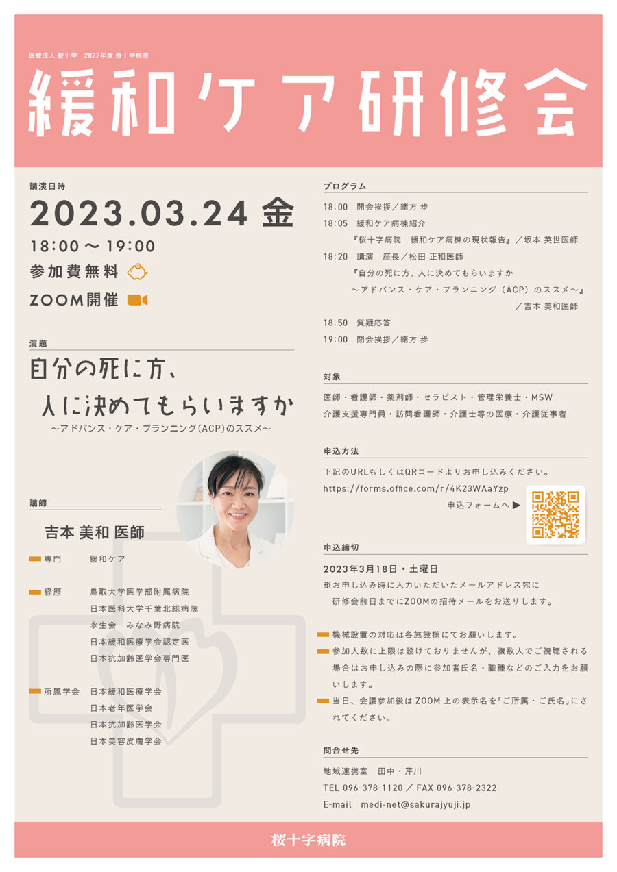 医療法人桜十字 桜十字病院より、2022年度緩和ケア研修会を開催いたします。今年は吉本美和医師から、「自分の死に方、人に決めてもらいますか~アドバンス・ケア・プランニング(ACP)のススメ~」という演題でお話していただきます。ZOOM配信での開催、参加費も無料となっております。是非多くの皆様のご参加お待ちしております。