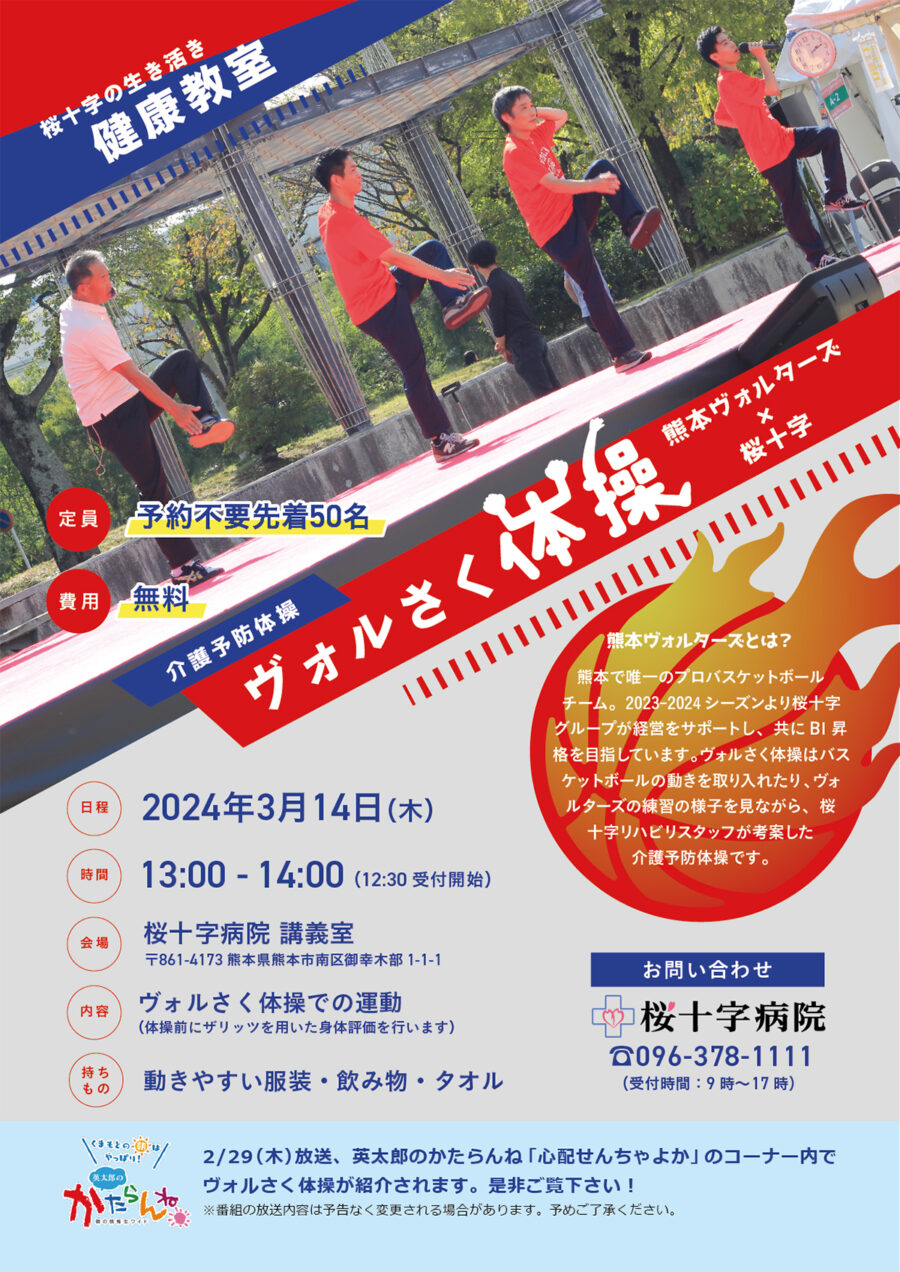 3月の生き活き健康教室では、桜十字病院と熊本のプロバスケットボールチーム、熊本ヴォルターズとタッグを組んでリハビリスタッフが考案した介護予防体操、ヴォルさく体操を行います。