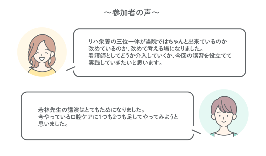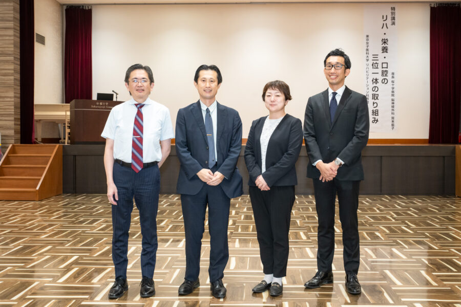 そして今回の特別ゲスト、東京女子医科大学 リハビリテーション科教授、若林秀隆先生にお越しいただき、「リハ・栄養・口腔の三位一体の取り組み」と題して、ご講演いただきました。「栄養リハ」「サルコペアの嚥下障害」「医科歯科連携」「こころのリハ栄養」といった4つの小テーマのもと、実際の症例とともに「リハ・栄養・口腔が双方に関わり合うことの大切さ」についてお話しされました。特に参加者も興味を示していた「こころのリハ栄養」においては、「マイナスを0に近づけるのではなく、0からプラスを増やしていく」重要性をご教示くださいました。そのお話の中で、桜十字病院を見学した時のことについてお話しいただき、「桜十字病院はスタッフの心にとっても良い環境なのではないかと思った」といった率直なご感想は、私たちスタッフにとっても大変嬉しいお言葉でした。桜十字病院は今後も患者さま、そしてスタッフの「こころのリハ栄養」について、改めて考えてまいります。