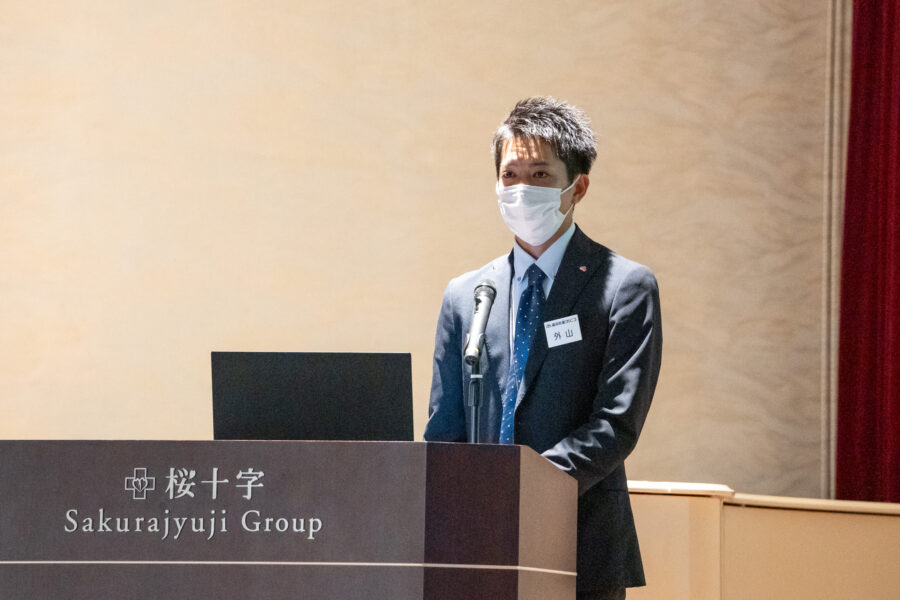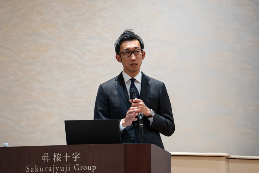 次に、桜十字病院の理学療法士、髙野より「“超職種型”多職種連携の取り組み ~脳出血後の長期人工呼吸器管理から離脱し食事獲得できた頚髄損傷例~」と題した一般演題を行いました。