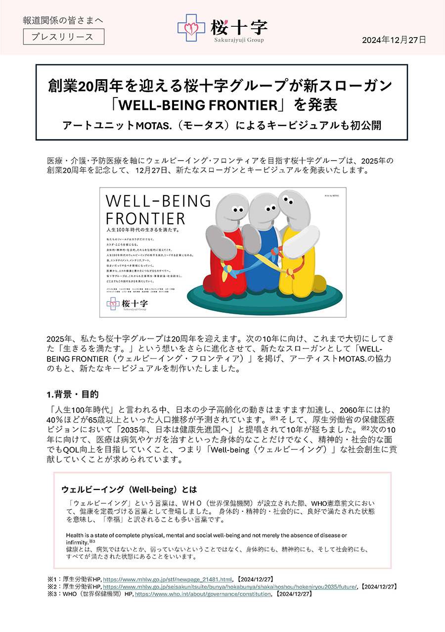 医療・介護・予防医療を軸にウェルビーイング・フロンティアを目指す桜十字グループは、2025年の創業20周年を記念して、 12月27日、新たなスローガンとキービジュアルを発表いたしました。