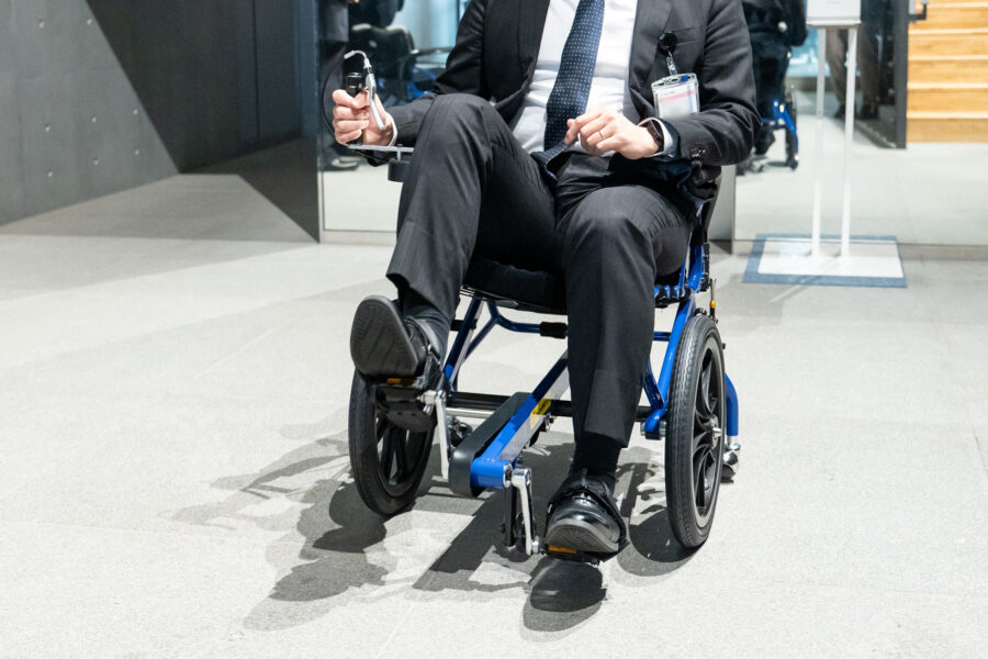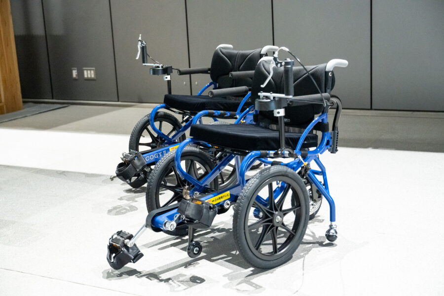 ペダル付き車いす「COGY(コギー)」は、自転車のように足でペダルを漕いで、動かす車いすです。歩行が難しい方でも左右どちらか片方の足を少しでも動かすことができれば、反射によって自分の両足でペダルを漕ぎ、進むことができる可能性があります。今回桜十字病院がいただいたのは、日本製としてさらに快適で使いやすいデザインとなった『COGY Ⅱ』です。