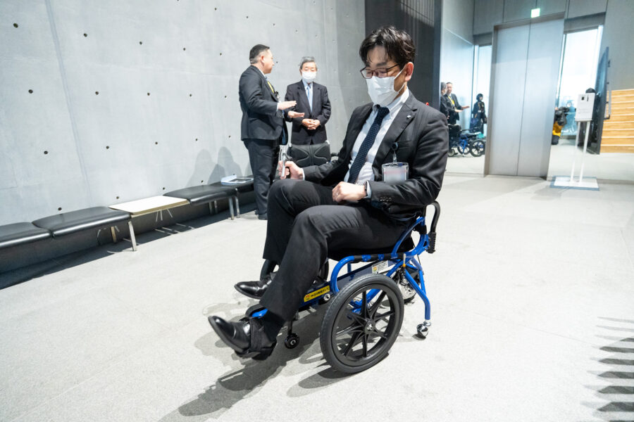 贈呈式後はご担当者の方から、「COGY」のご説明をいただきました。説明時には実際に松本副部長が試乗。軽く足を動かすだけで漕ぐことができる「COGY」の操作性や機能性の高さを体感しました。