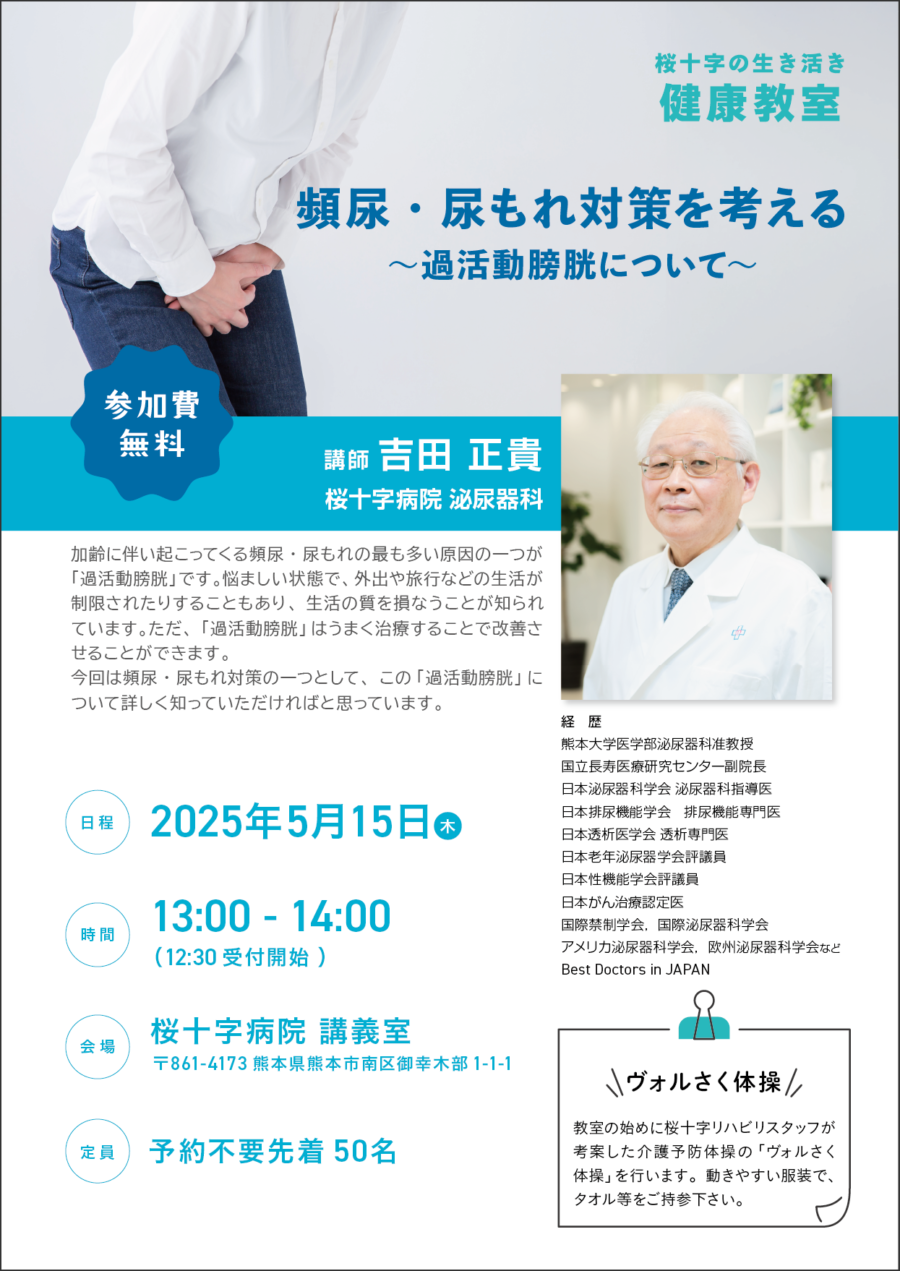 5月の生き活き健康教室は、すっきりぐっすり排尿外来の吉田正貴医師より「頻尿・尿もれ対策を考える~過活動膀胱について~」お話いたします。