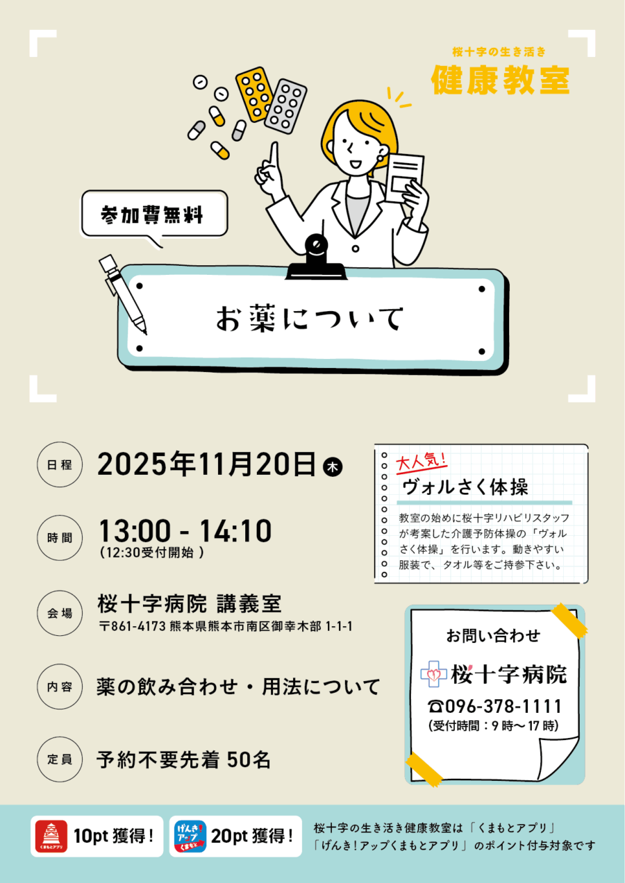 ※桜十字の生き活き健康教室は「くまもとアプリ」並びに「げんき!アップくまもとアプリ」のポイント付与対象講座となっています。