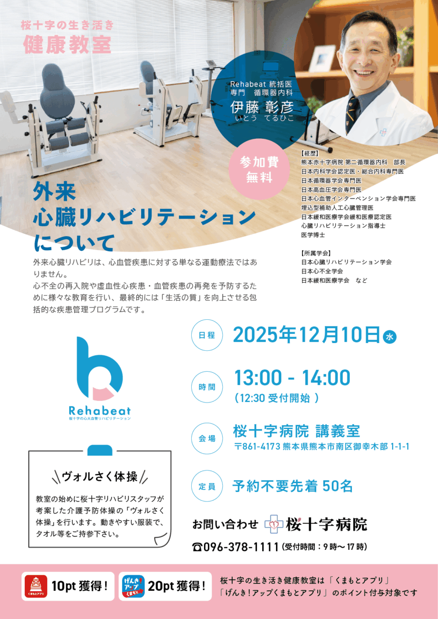 12月の生き活き健康教室は、桜十字病院 循環器内科 Rehabeat 統括医の伊藤彰彦医師より、外来心臓リハビリテーションについてお話しいただきます。