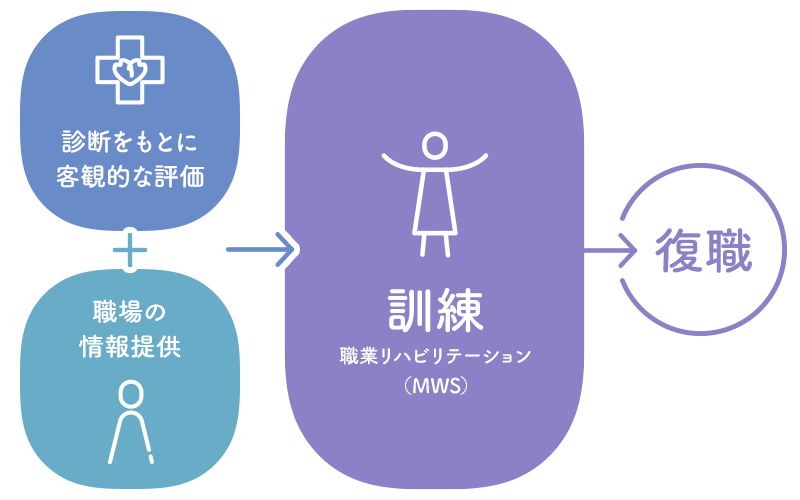 医師の診断をもとに多職種で客観的な評価をするのと同時に、職場からの情報提供をもとに患者さまが安心して復職できるよう、幅広いスタッフがチームとなって支援していきます。