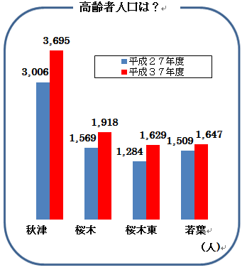10年後の秋津、桜木、若葉校区は減少予想、桜木東校区はやや増加予想です。