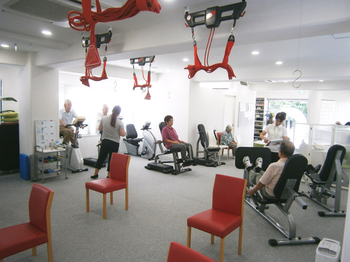 理学療法士を中心とした専門職の運動サポートで、明るい雰囲気のまるでスポーツジムの様な施設です。