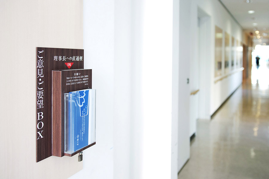 ご意見やご要望を直接理事長まで届ける、理事長直通便ボックスを設置。いただいたお声は患者さま満足室・患者さま満足委員会・各部署で共有し、より良い病院づくりに取り組んでいます。