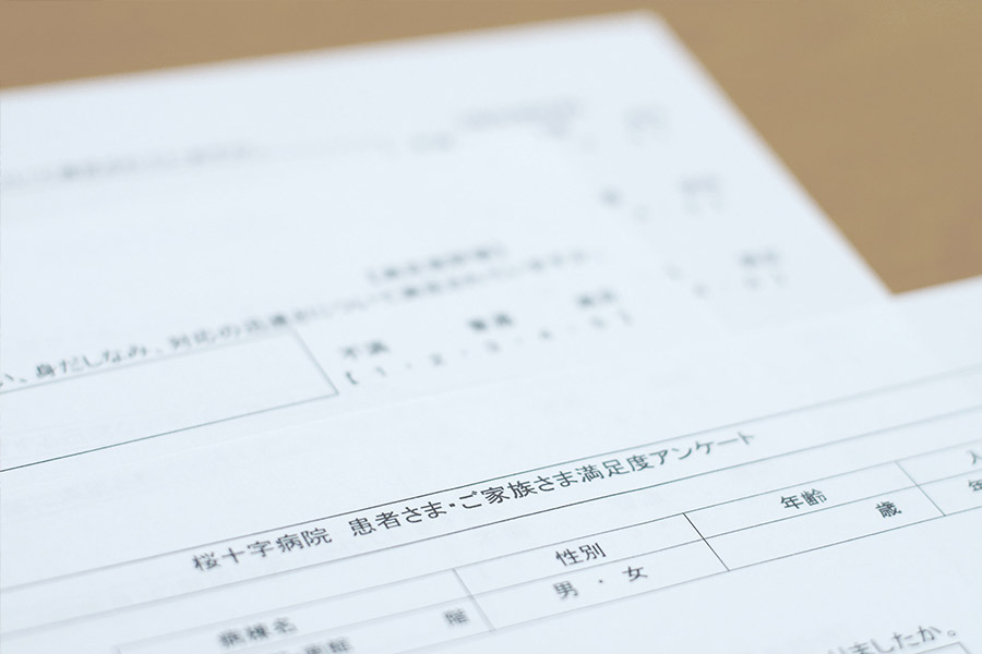 年に2回、患者さま満足アンケートを実施。忌憚のないご意見をお聞きしたいと、選択項目と自由回答欄を設けています。記入の難しい方のために、口頭聴取も行っています。