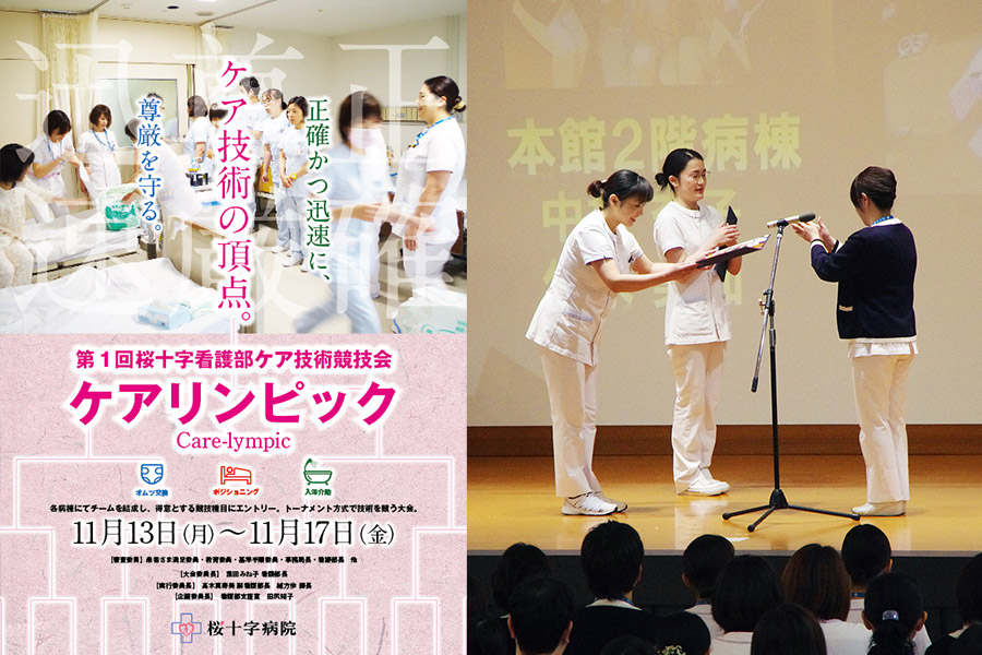 ケアの標準化と質向上を目的とし、ケア技術の院内競技会を実施。病棟を1チームとしてすべての病棟がエントリーし、トーナメント方式で技術を競いました。