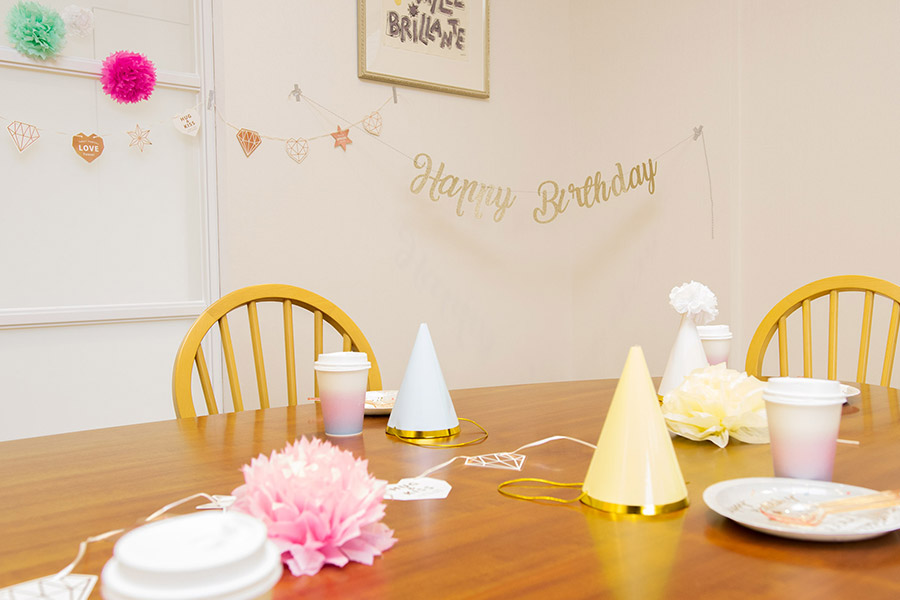 家族が集まるリビングのように。完全予約制のシェアルームは、貸し切りで家族やご友人とプライベートな時間をお過ごしいただけます。ケーキのご予約や飾りつけのご依頼もお受けします。