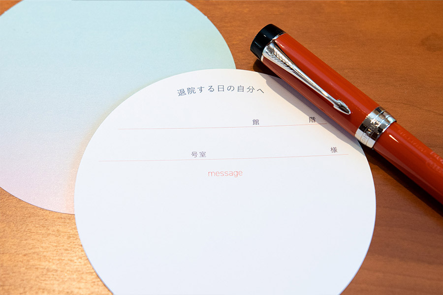 未来の自分にメッセージを託せる便せんを設置。退院後にやりたいことや、頑張った自分への労い、退院して社会に復帰する自分へのエールなど、さまざまな思いをリハビリや療養の励みに。