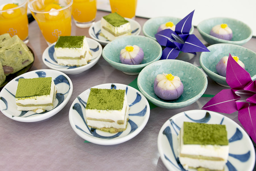 食材搬入から食器保管まで一連の流れでの衛生管理は良好である。調理室の床はドライ使用であり、清潔・不潔の区別も色分けしている。調理器具の保管などの衛生面も問題ない。栄養管理部の事務室は透明ガラスのため廊下からオープンに見ることができ、清潔感のある事務室である。嗜好調査は年2回行い、若年層の入院増加により嗜好も多様化しており、病棟にリクエストボックスを設置し、患者のリクエストに応じる「リクエストメニュー」にも取り組んでいる。「日本を旅する故郷の味めぐり」と称し、摂食量増加を目的に各県の代表的な食を週1回提供し、1年で日本一周するユニークな取り組みを継続している。四季彩膳は、四季を飾る食材や普段使用しない食材を取り入れ、月1回の行事食として弁当箱やプレートにて提供し、家族にも同じ食事を提供しており、患者と一緒に楽しめる行事である。また、誕生日にはバースデーケーキを作り、バイキング形式でおやつを選ぶことができる楽しい企画も行っている。水分補給のためお茶ゼリーなどの工夫もあり、食器類は全て砥部焼で使い勝手を検討したオリジナルの陶器を使用し、種々の取り組みは高く評価できる。